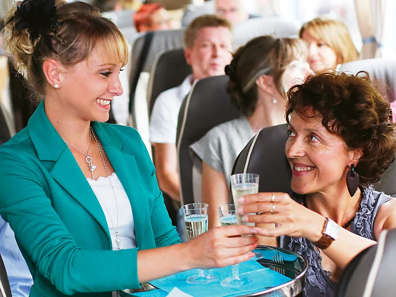 Für Ihr leibliches Wohl wird gesorgt - auch an Bord unserer Busse! Wählen Sie aus unserer reichhaltigen Speise- und Getränkekarte, zu fairen Preisen. Unsere Reiseleitung nimmt Ihre Wünsche gerne entgegen und umsorgt Sie mit liebenswürdigem Service und schmackhafter Verpflegung, auch vegetarisch.
