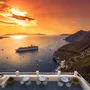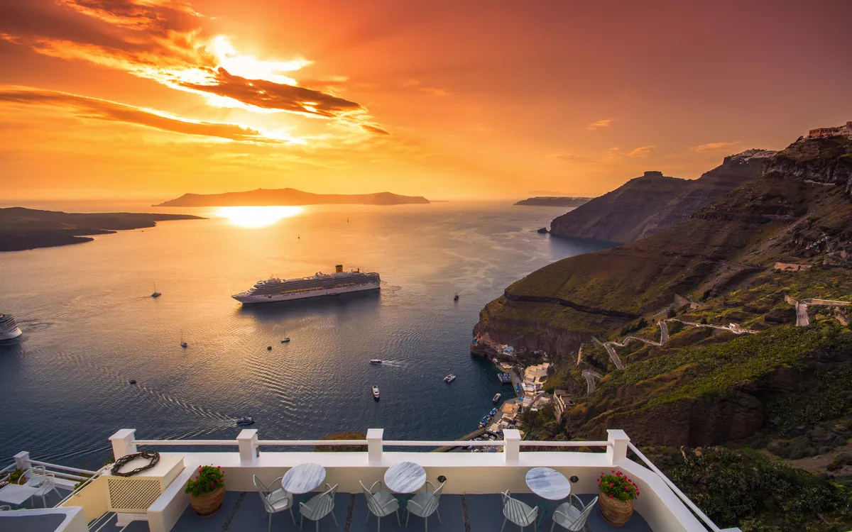 Abendansicht von Santorini mit Kreuzfahrtschiffen bei Sonnenuntergang
