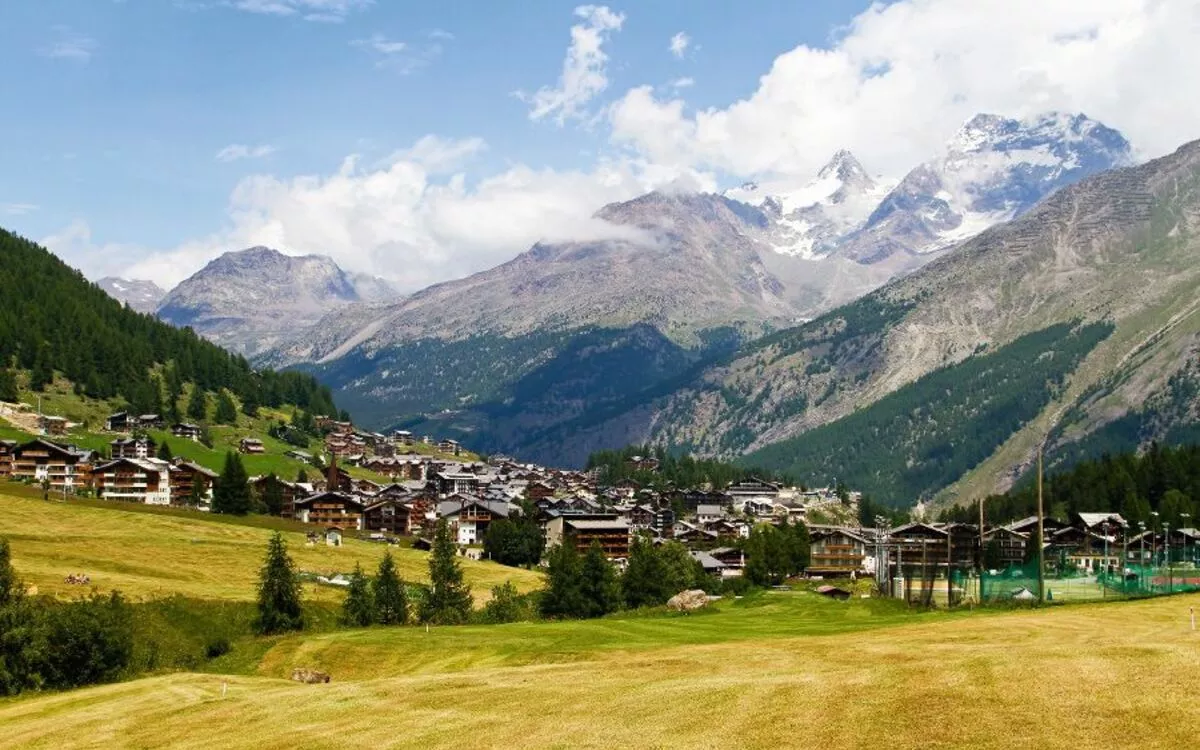 Der Ort nennt sich heute Freie Ferienrepublik Saas-Fee. Die typischen Häuser des Wallis sind hier am schönsten. Und um den Ort herum stehen die stolzen Viertausender mit Gletschern zum Anfassen. Bei stahlblauem Himmel empfiehlt es sich, vom Saastal, einer der Perlen der Alpen, mit der Luftseilbahn weit hinauf zum Allalingletscher zu schweben und eine herrliche Aussicht über die Südschweizer Alpen zu genießen (nicht inkl., ca. € 65 –  Saas-Fee – Mittelallalin). Hoch oben auf 3.500 Metern befindet sich auch ein 360-Grad-Panorama-Restaurant. Schon vom Dorf Saas-Fee aus erscheint das Allalinhorn (4.027 m) wie eine mächtige Pyramide aus Schnee und Eis.