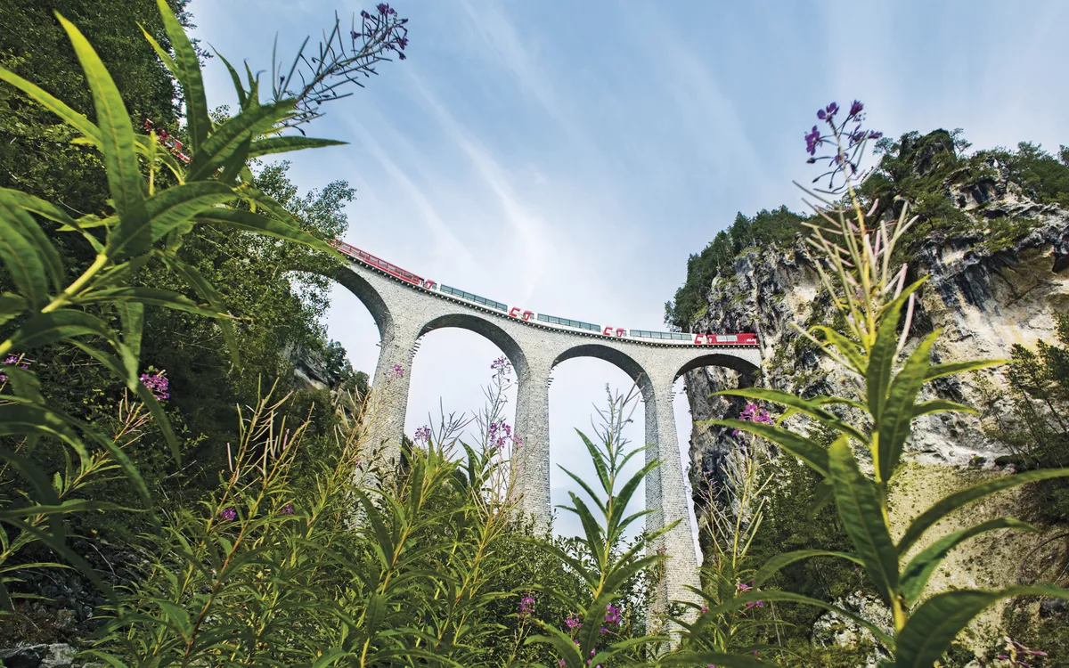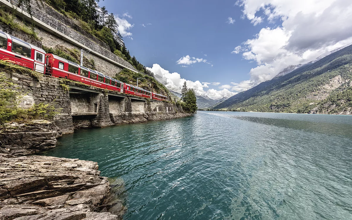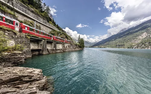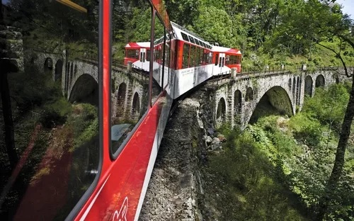 Erleben Sie heute eine unvergessliche Reise durch 55 Tunnels und über 196 Brücken! Der Bernina Express fährt auf den höchsten Bahngleisen Europas und den steilsten der Welt. Von der ältesten Stadt der Schweiz durch wildromantische Schluchten, vorbei an spektakulären Kunstbauten wie dem Landwasserviadukt, hinauf zum ewigen Eis der Gletscher und wieder hinab bis zu den Palmen im italienischen Tirano: Es gibt keine spektakulärere Bahnstrecke durch die Alpen! Die modernen Panoramawagen sind ein weiterer Höhepunkt! Erstklassiger Reisekomfort und atemberaubende Landschaften, die zum Greifen nah erscheinen. Ihre Fahrt beginnt in Thusis und endet in Tirano (oder umgekehrt).