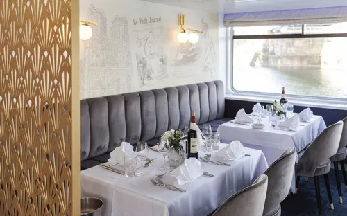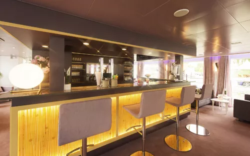 Sie sind Gast der MS Douce France (5 Anker), ein Schiff der französischen Reederei CroisiEurope. Das Schiff ist 110 m lang, 10 m breit und verfügt über 55 Kabinen auf 2 Decks. Alle klimatisierten Kabinen sind Außenkabinen und verfügen über zwei untere Betten, Dusche/WC, Föhn, Fernseher, Safe, und Panoramafenster (Oberlichter im Oberdeck, zur Hälfte zu öffnen und im Hauptdeck nicht zu öffnen). Geschmackvoll und freundlich eingerichtet sind die Gesellschaftsräume, wie der klimatisierte Salon mit Bar und das Restaurant, in dem die Mahlzeiten (Buffetfrühstück und am Tisch serviertes Mittag- und Abendmenü) in einer Sitzung eingenommen werden. Auf dem großen Sonnendeck stehen Liegestühle zur Verfügung.