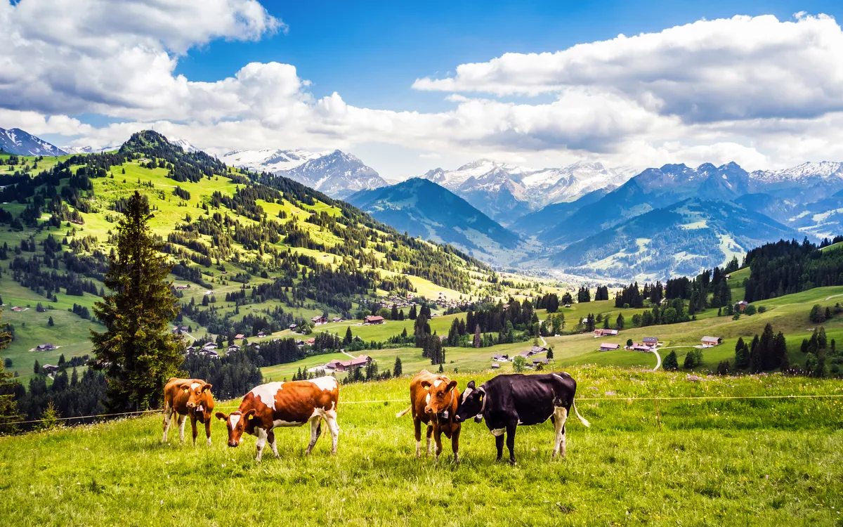 Kühe im Simmental im Berner Oberland, Schweiz