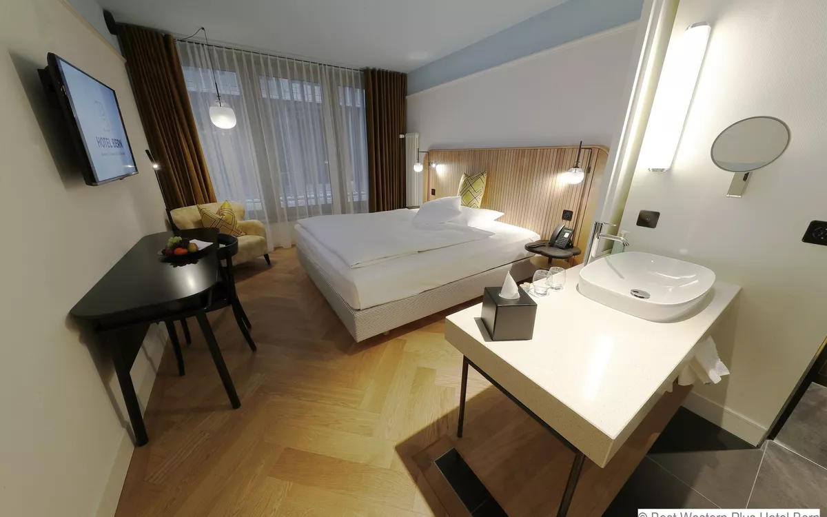 Das 4-Sterne-Best Western Plus Hotel Bern liegt zentral in der Altstadt von Bern; das in der Fußgängerzone gelegene und denkmalgeschützte Haus wurde 2018/2019 vollständig renoviert und bietet ein Restaurant, eine zauberhafte Loft-Bar mit Terrasse über den Dächern von Bern, Lift und Internetanschluss. Die Zimmer sind mit Bad oder Dusche/WC ausgestattet sowie mit Fön, Sat-TV, Radio, Klimaanlage, Minibar und kostenfreiem Wi-Fi. Ein kalt-warmes Buffetfrühstück und ein 3-Gänge-Menü zum Abendessen werden Ihnen zur Halbpension gereicht.