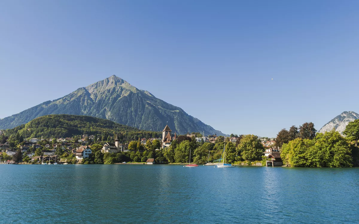 Thunersee im Berner Oberland mit Blick auf Schloss Spiez, Schweiz