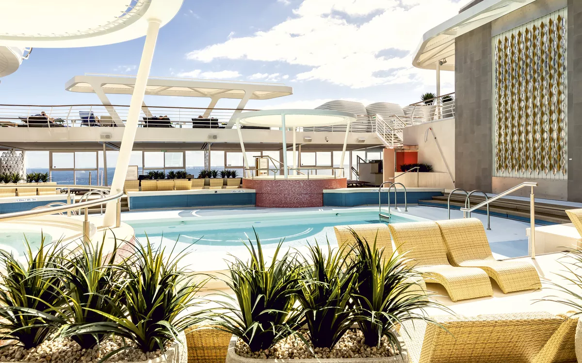 Ab ins kühle Nass. Nutzen Sie Ihren Seetag, um im weitläufigen Pool Ihre Bahnen zu schwimmen oder sich in unserer Lagune an Bord abzukühlen und im Wasser zu entspannen. Auch in den Whirlpools kann man sich unter freiem Himmel ganz wunderbar die Zeit vertreiben.
