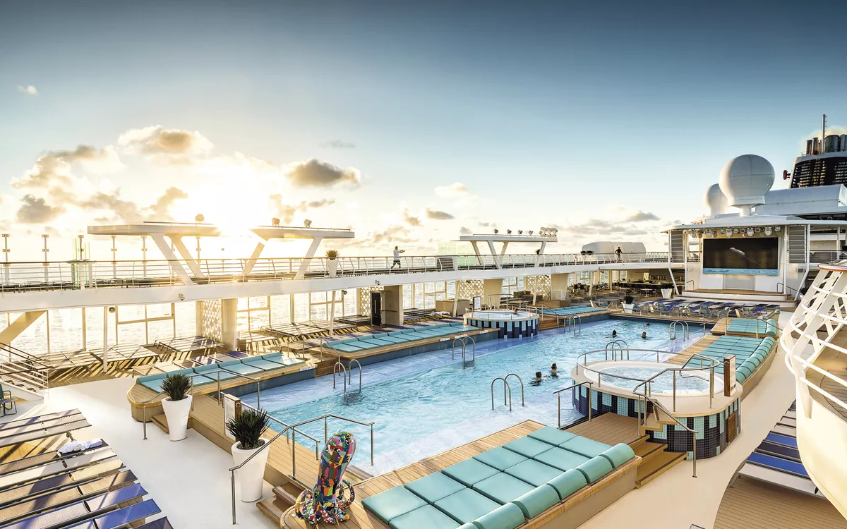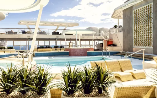 Ab ins kühle Nass. Nutzen Sie Ihren Seetag, um im weitläufigen Pool Ihre Bahnen zu schwimmen oder sich in unserer Lagune an Bord der Mein Schiff 2 abzukühlen und im Wasser zu entspannen. Auch in den Whirlpools kann man sich unter freiem Himmel ganz wunderbar die Zeit vertreiben.