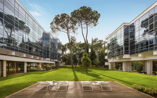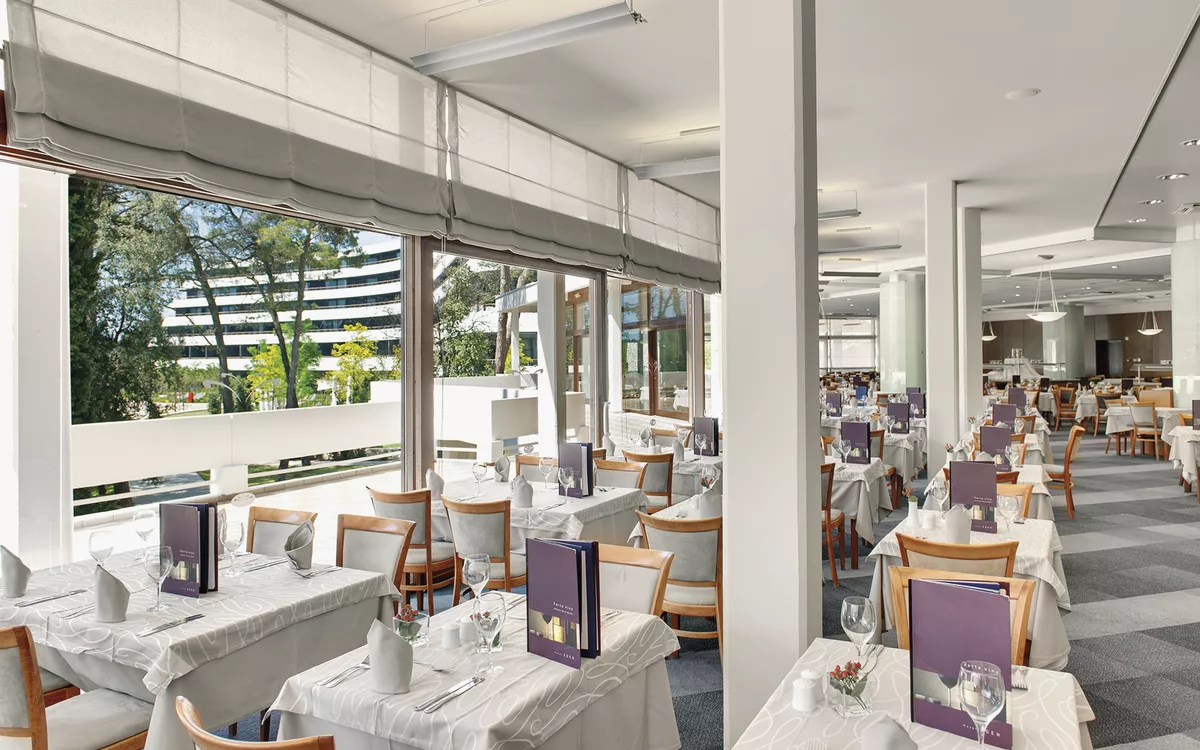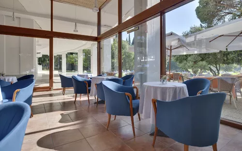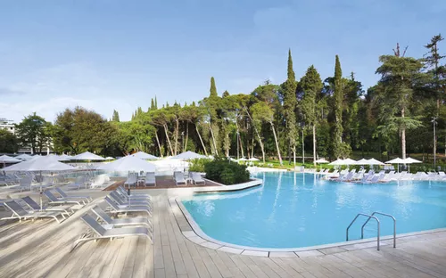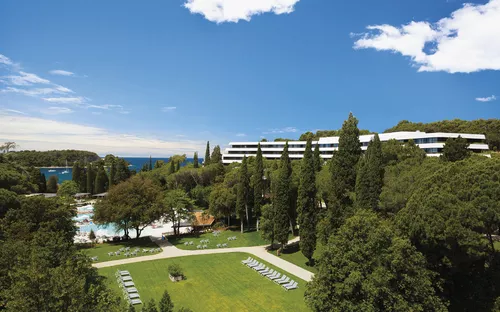 Traumhaft in einer Bucht gelegen und inmitten des schattenspendenen Waldparks Zlatni präsentiert sich das 4-Sterne-Hotel Eden, ca. 20 Gehminuten vom Zentrum Rovinjs. Den flach abfallenden Kiesstrand erreicht man nach einem kurzen Spaziergang durch den Hotelpark. Das Hotel bietet drei Restaurants, Bars, eine Poolbar, eine Sonnenterrasse einen Meerwasser-Indoorpool und einen Wellness-Bereich mit Whirlpool. Die stilvoll eingerichteten Zimmer gibt es mit Bad oder Dusch/WC; sie enthalten Fön, Balkon, Teppichboden, Minibar, Klimaanlage und der Bademantel ist für die Dauer Ihres Aufenthaltes inklusive.