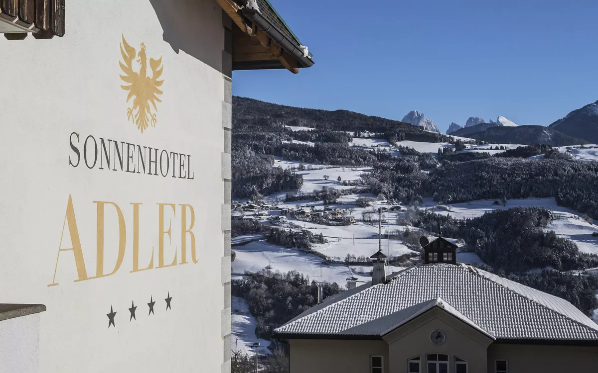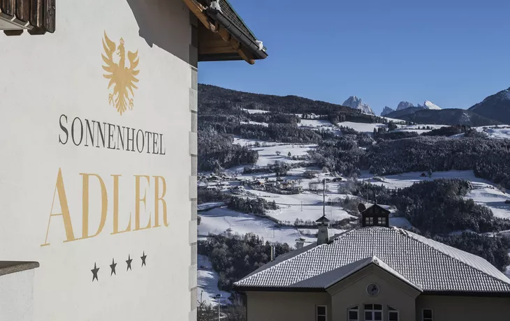 Das 4-Sterne Hotel Sonnenhotel Adler im historischen Ortskern von Villanders am Eisacktaler Sonnenhang mit Blick auf die Dolomiten.