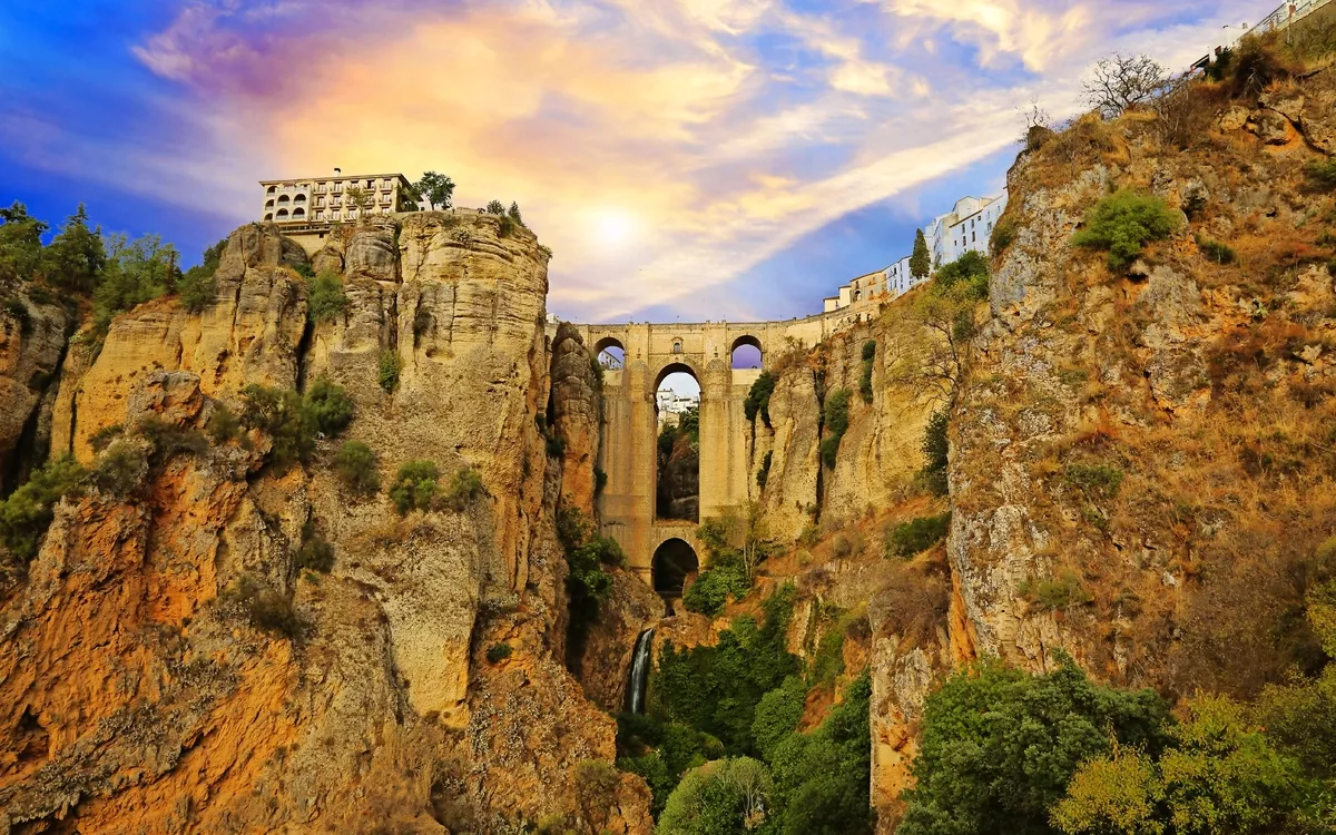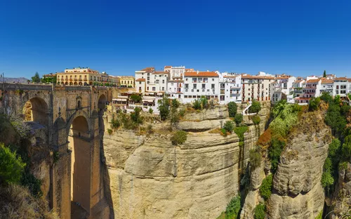 Die Schlucht und die darüber verlaufende "Puente Nuevo", die in einer Höhe von beinahe 100 Metern im 18. Jahrhundert erbaut wurde, sind das Wahrzeichen von Ronda. Dort können Sie auch die Stierkampf-Arena, das römische Theater und die Puerta de Almocábar sehen. Über die Region der "weißen Dörfer" kehren Sie zurück zur Costa del Sol.