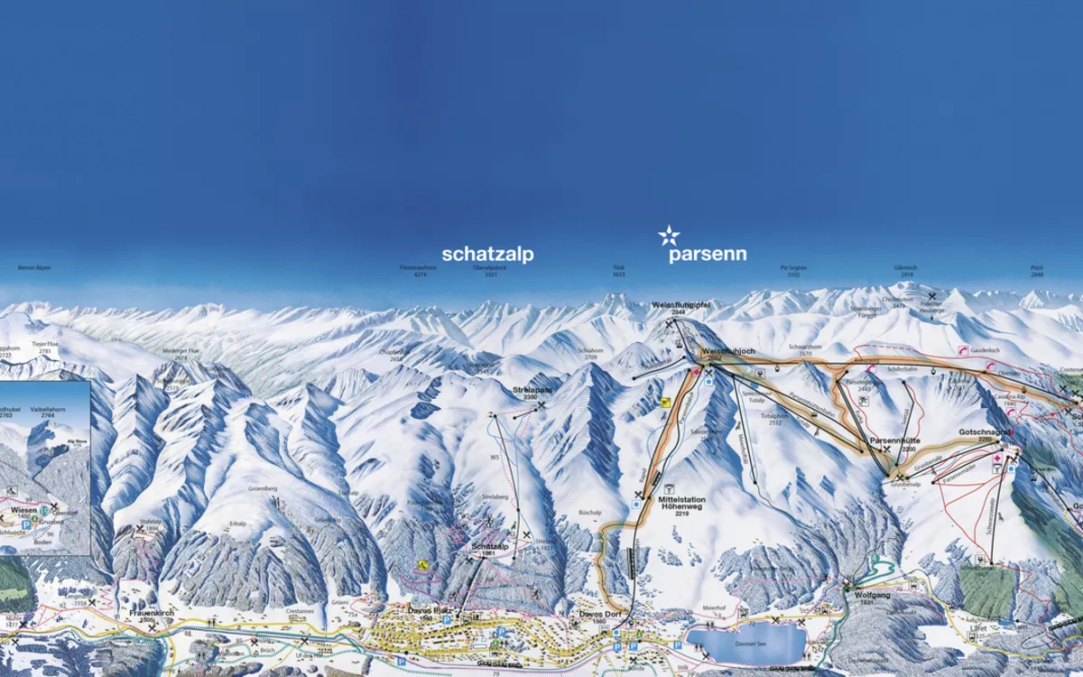 Die Bündner Bergorte Davos und Klosters sind die Heimat der Davos Klosters Mountains. Wintersportler erwartet hier ein abwechslungsreiches Angebot: Insgesamt stehen 253 Kilometer bestens präparierte Pisten und rund 80 Abfahrten in fünf Schneesportgebieten (Parsenn, Jakobshorn, Rinerhorn, Madrisa und Pischa) zur Verfügung.