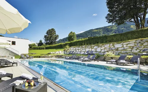 Modernes Hotel mit traditionellem Charme der Alpen, modernem Flair und herzlicher Gastlichkeit, 120 Zimmer, 3 Lifts, WLAN, Restaurant mit Sonnenterrasse, 1.000 m² Spa, Liegewiese mit Blick zum Kitzsteinhorn. Örtl. Kateg. 4 Sterne.
