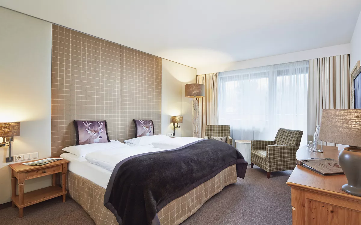 Wohlfühlzimmer im modern alpinen Design mit viel Holz und warmen Farben mit Bad oder Dusche, WC, Balkon, Föhn, Minibar (Befüllung auf Wunsch), Safe, TV, Parkett.