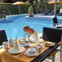 Frühstücksbuffet auf der Terrasse am Swimmingpool, hervorragende Küche, mittags und abends 3 Vorspeisen und 3 Hauptspeisen zur Wahl, Gemüse- und Dessertbuffet. Inkl. ½ l Wasser und ¼ l Wein zu allen Mahlzeiten.