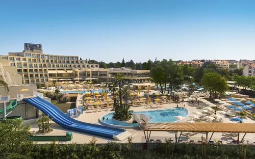 Hotel mit Gartenanlage, 126 Zimmer, 3 Etagen, Lift, Aufenthaltsraum mit Bar, Wlan, Swimmingpool, Liege und Sonnenschirm am Pool inkl. Örtl. Kat. 3 Sterne.