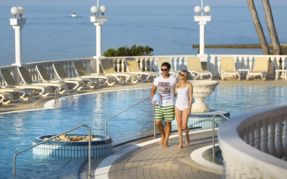 Schickes, klassisches Design, 120 Zimmer und Suiten, Lift, Aufenthaltsräume, Garten, 2 Bars mit Terrasse, gemütliches Restaurant, Cafe, Wlan, 2 Außenpools mit Meerwasser, Sonnenterrasse, Liegen und Sonnenschirm am Pool und Strand inkl. Örtl. Kat. 3 Sterne.