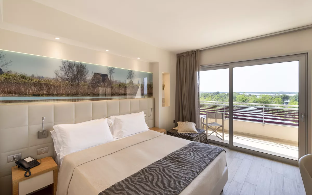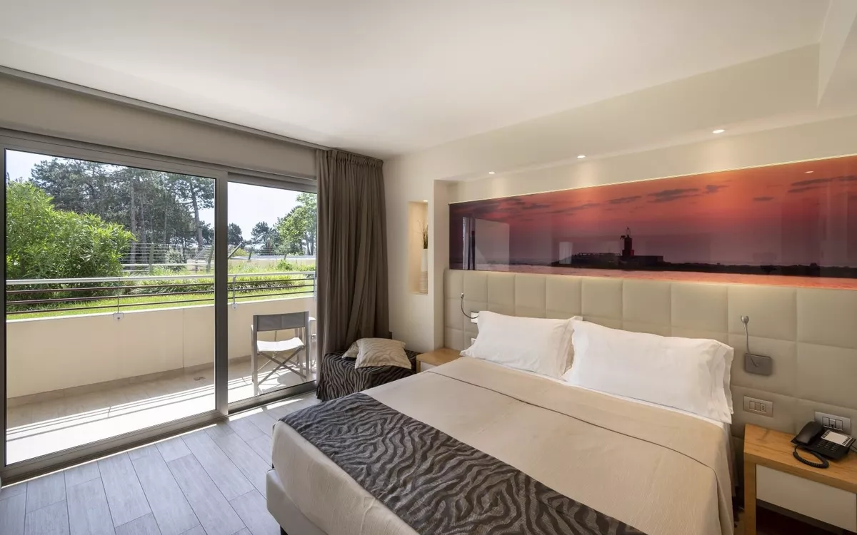 im 1. bis 2. Stock oder 3. Stock Ostseite gelegen, mit Dusche, Föhn, Balkon, Hartboden, Minibar, Kapselmaschine und Wasserkocher, Klimaanlage inkl., TV, Strandtücher, Safe.