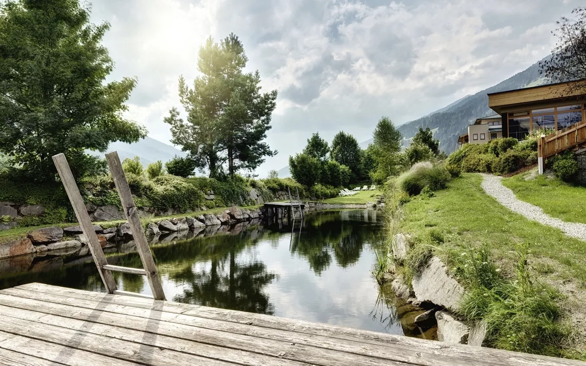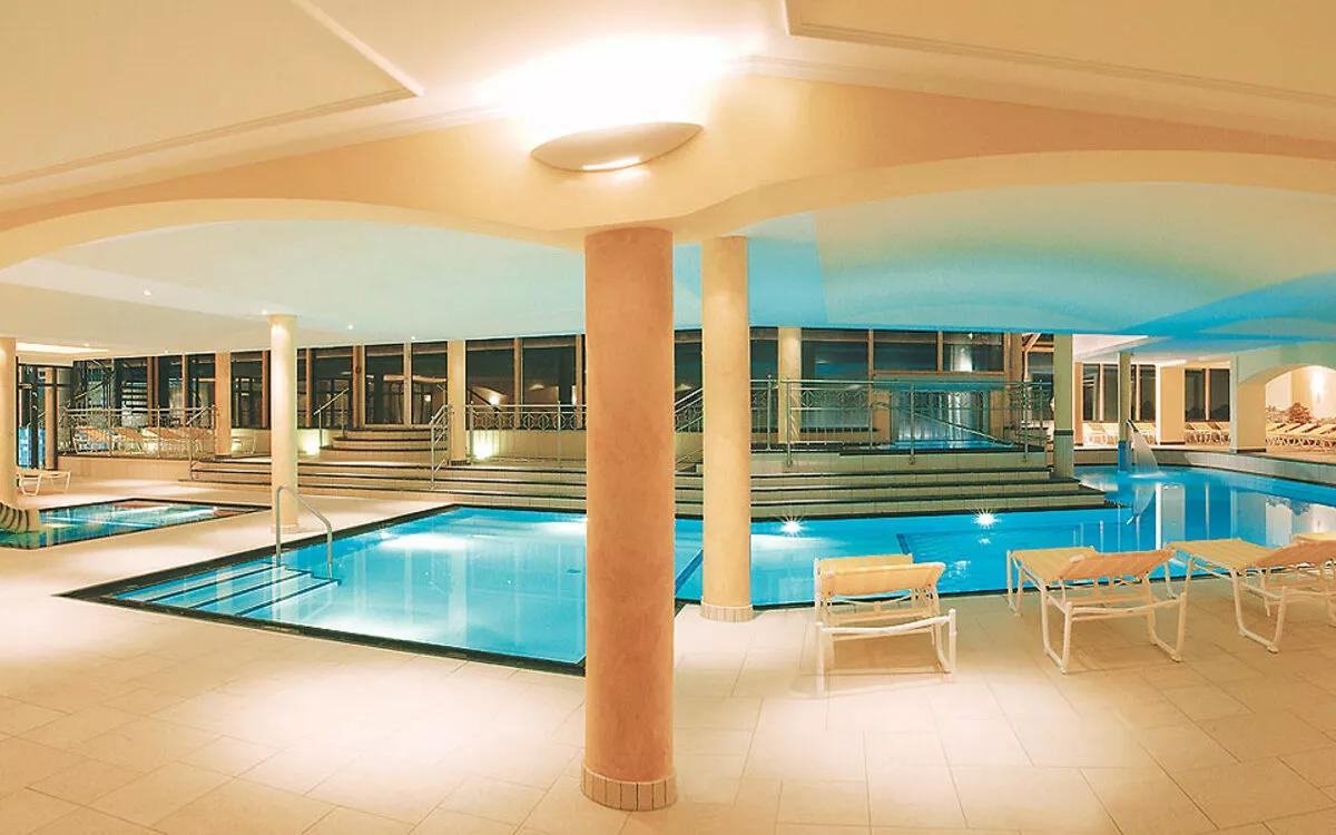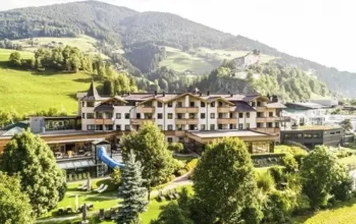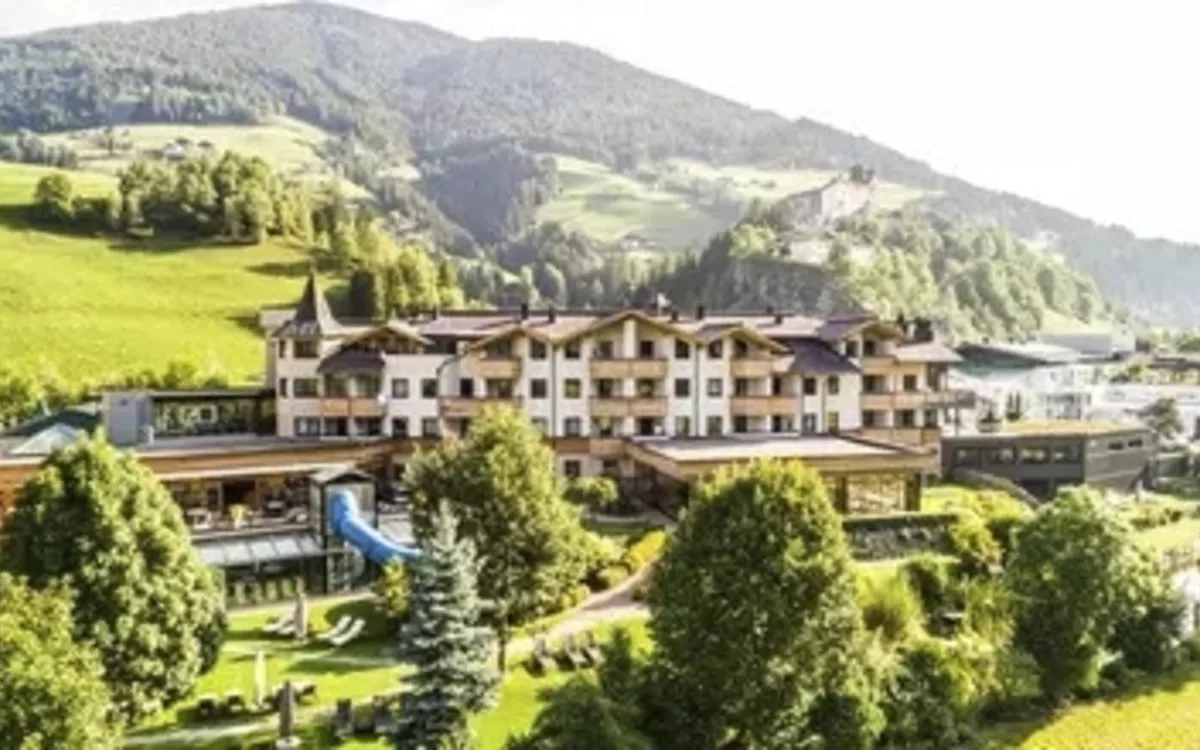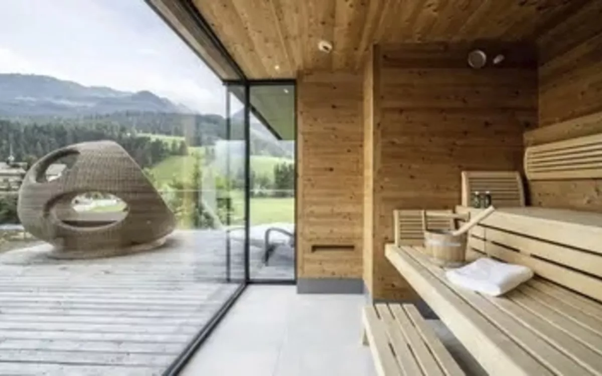 3000 m² Wellnesslandschaft mit Innen- und Außenpool, Ritter-Dampfbad, Tiroler Kräuterbadl, Salzsteingrotte, Bio-Schwitzstube, Latschensauna, Kneipp-Rondell, Lichtterapie, Ruhebereiche.